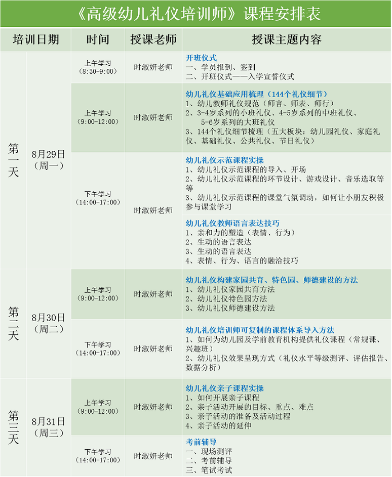 目前很多學(xué)前教育機(jī)構(gòu)、幼兒園已經(jīng)開(kāi)展了禮儀課程,為了解決各地幼兒禮儀培訓(xùn)師資緊缺的問(wèn)題,幫助幼兒禮儀教育工作者掌握禮儀教學(xué)訓(xùn)練內(nèi)容和教學(xué)規(guī)范、增強(qiáng)實(shí)際應(yīng)用授課能力、提高師資水平和質(zhì)量,建立專業(yè)幼兒禮儀培訓(xùn)教師隊(duì)伍,增強(qiáng)禮儀實(shí)際應(yīng)用及教育成果轉(zhuǎn)化,知行德禮教育、廣州市禮儀協(xié)會(huì)將于2022年8月29日--31日在廣州舉辦《高級(jí)幼兒禮儀培訓(xùn)師》詳情如下: