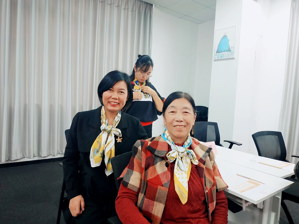戴老師邊講解邊演示了絲巾的系法和搭配方式,會員朋友們在邊聽邊學(xué)的過程中收獲了絲巾搭配的技能,也收獲了快樂,系著自己親手制作的絲巾,看到變得更加美麗的自己,大家臉上都露出了欣喜的笑容。