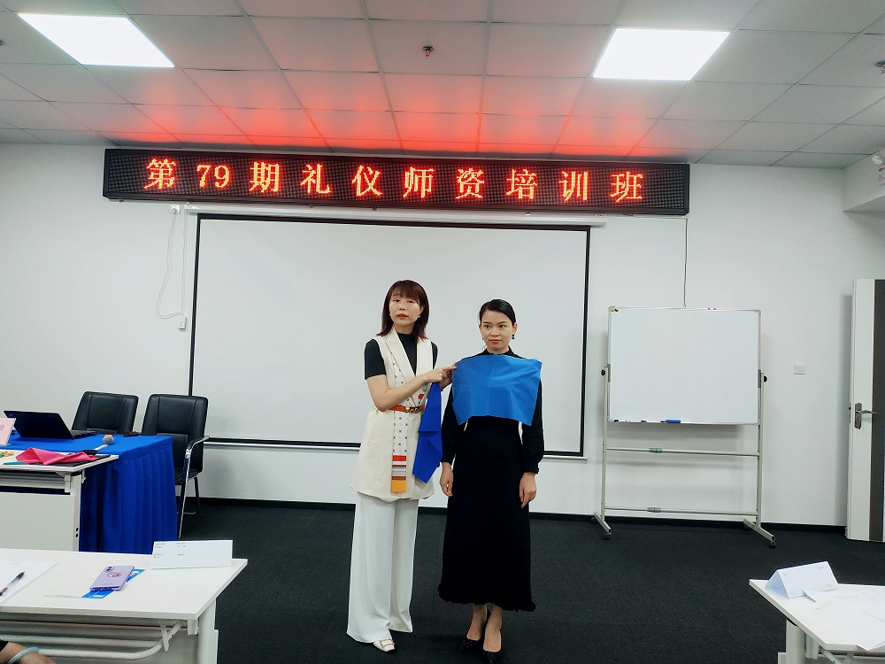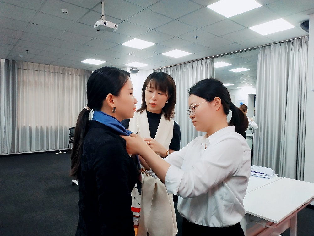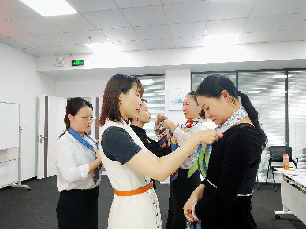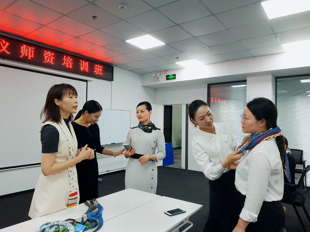 劉老師為大家講解了服裝色彩搭配等方面的理論知識(shí),并教授學(xué)員如何根據(jù)自己的膚色來選擇適合自己的服裝、如何根據(jù)體形進(jìn)行搭配服裝、如何靈活運(yùn)用絲巾搭配來打造職業(yè)禮儀培訓(xùn)師的專業(yè)形象。