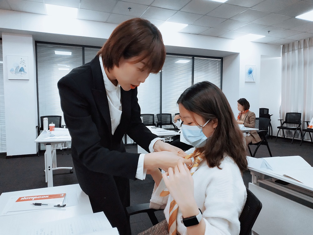劉老師為大家講解了服裝色彩搭配等方面的理論知識(shí),并教授學(xué)員如何根據(jù)自己的膚色來(lái)選擇適合自己的服裝、如何根據(jù)體形進(jìn)行搭配服裝、如何靈活運(yùn)用絲巾搭配來(lái)打造職業(yè)禮儀培訓(xùn)師的專業(yè)形象。