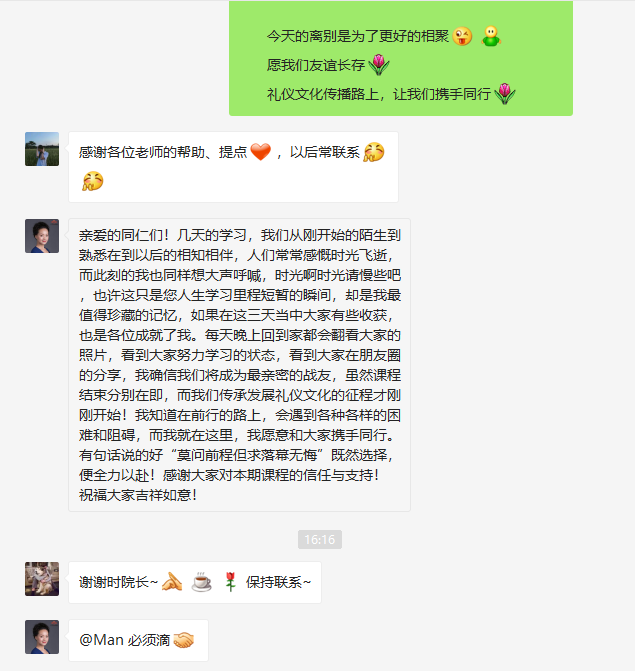 雖然本期師資培訓(xùn)學(xué)習(xí)已經(jīng)結(jié)束,但是相信各位學(xué)員通過(guò)本期禮儀師資培訓(xùn)學(xué)習(xí),不僅收獲了實(shí)用、實(shí)際、實(shí)效的禮儀教學(xué)方式與方法,也收獲了滿滿的友誼!相信本期禮儀培訓(xùn)師都能夠在今后的禮儀培訓(xùn)教學(xué)中學(xué)以致用,將專業(yè)化的知識(shí)體系傳授給更多的學(xué)員,為傳承、弘揚(yáng)、發(fā)展禮儀文化做出自己的貢獻(xiàn)!